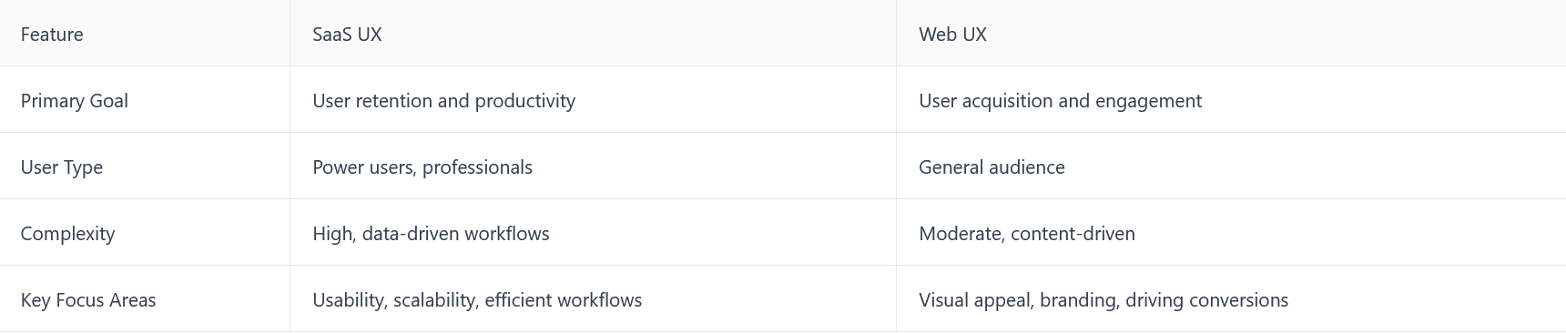 SaaS UX and web UX share some similarities, but they're not the same. Web UX is often focused on attracting new users and driving conversions. SaaS UX, on the other hand, is focused on retaining existing users and helping them be productive. SaaS platforms often handle complex data through the use of dashboards and analytical tools. Here's a quick comparison: